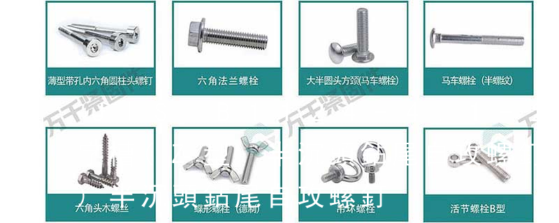 1.機螺釘 2.自攻螺釘 3.鉆尾螺釘 4.墻板釘 5.纖維板釘 6.木螺釘7.六角木螺釘 8.不脫出螺釘 9.組合螺釘 10.微型螺釘 11.家具螺釘 12.電子螺釘 頭型 :1.六角頭(hexagon head) 2.六角頭法蘭面(hexagon head w