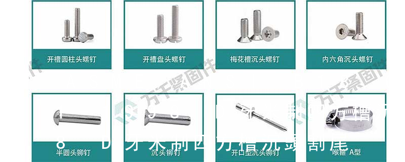 CSK 沙拉頭(沉頭) Large wafer 大扁平頭 Bugle 喇叭頭 Truss 盤頭帶墊 Pozi 米制槽 Phill 十字槽 Serra-tion 墊下帶花 Flower Head 開花頭 6-bobes recess 內梅花 Piston bolt 活塞螺釘 Winding bolt 線圈螺釘 Hexagon head bolts