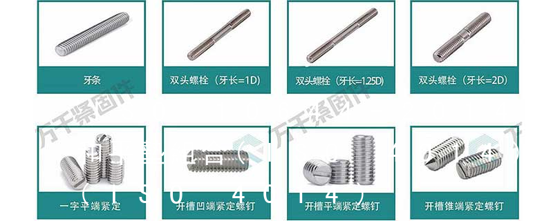 螺栓類:外六角螺栓、外六角法蘭面螺栓、內六角圓柱頭螺栓、吊環螺栓、膨脹螺栓、沉頭內六角螺栓、盤頭內六角螺絲、馬車螺栓、雙頭螺栓、蝶型螺絲、活節螺栓、地腳螺 栓、U型螺栓、四角螺栓等 螺帽類:鉚螺母、吊環螺母、