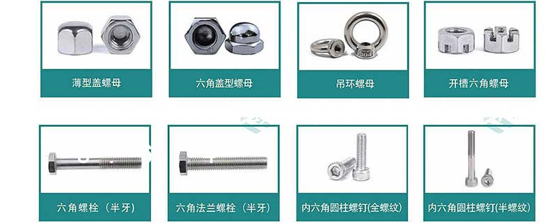 1.機螺釘 2.自攻螺釘 3.鉆尾螺釘 4.墻板釘 5.纖維板釘 6.木螺釘7.六角木螺釘 8.不脫出螺釘 9.組合螺釘 10.微型螺釘 11.家具螺釘 12.電子螺釘 13.鏈帶螺釘頭型 :1.六角頭(hexagon head)2.六角頭法蘭面(hexagon head with flange)3.方頭(square head)4.T形頭T head (hammer head5. 名稱: 1.機螺釘 2.自攻螺釘 3.鉆尾螺釘 4.墻板釘 5.纖維板釘 6.木螺釘7.六角木螺釘 8.不脫出螺釘 9.組合螺釘 10.微型螺釘 11.家具螺釘 12.電子螺釘 頭型: 1.六角頭(hexagon head) 2.六角頭法蘭面(hexagon head with flange) 3.方頭(square head) 4.T形頭T head (hammer head)5.扁圓頭mushroom